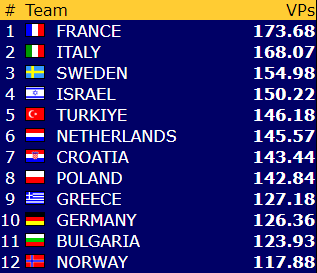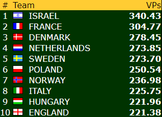 U26 Open Norge - Frankrike 0 - 20 (IMP-score: 17 - 84) Norge - Estland 8,33 - 11,67 (IMP-score: 26 - 32) Norge - Tyskland 1,73 - 18,27 (IMP-score: 5 - 49)