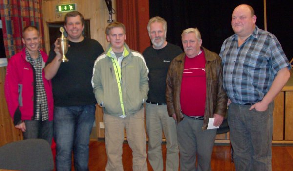 Baard Olav Aasan og Bård Kåre Græsli tok seieren i årets Snåsa Cup, foran Per Arne Flått og Jørn Arild Ringseth. Disse to parene skiftet på ledelsen mot slutten av turneringen, vinnerne spurtet best i sisterunden og vant med 2 poeng så det var spenning til siste kort var lagt. Den siste pallplassen tok Lars Tuseth og Per Erik Garli etter en sterk siste sesjon. Jørn Arild Ringseth vant for øvrig vandrepokalen som går over fem år til odel å eie. Seierspallen i Snåsa Cup 2009. Ellers debuterte Espen Flått i turneringssammenheng og gjorde sine saker veldig bra. Han og makker Eirik Nagelhus lå på den siste premieplassen etter første sesjon og endte opp på middels til slutt som er mer enn godkjent. Espen går nå nybegynnerkurs og har enda noen kvelder igjen av kurset, så dette ser lovende ut. Espen Flått debuterte under Snåsa Cup. Årets Snåsa Cup ble et vellykket arrangement og det er bra da turneringen har blitt avlyst de to siste årene. Ragnar Davidsen var spillende turneringsleder og hadde full kontroll slik at alle trivdes. Snåsa BK hadde i tillegg fått tak i masse spurtpremier fra det lokale næringslivet som alltid er populært. Ellers skryt til kjøkkenet som serverte knallgode kjøttkaker og dessert til meget hyggelige priser. For min egen del var dette mitt beste bord under turneringen. Ove Reidar ba meg også nevne de nydelige vaflene, som de sikkert hadde sukret godt. Jørn Arild Ringseth sikret seg vandrepokalen. Takk til Snåsa BK for en flott turnering, det er bare å begynne å planlegge neste års Snåsa Cup for turnering blir det. RESULTATER