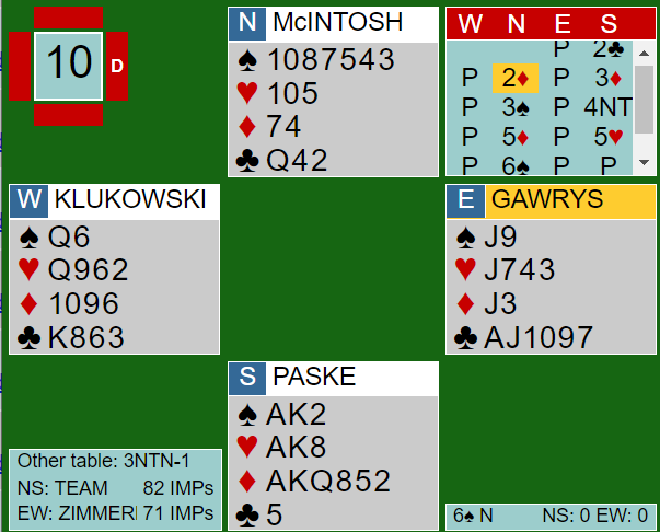 Paske-McIntosh meldte seg opp i den fine slemmen 6 kløver. Der ble det ble kun en kløvertaper, BLACK +1370.