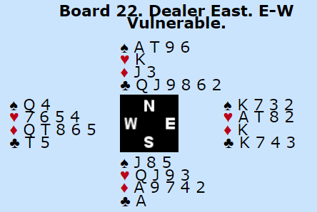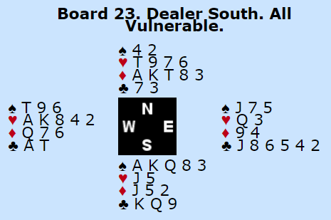 Ved det andre bordet kom også hjerter konge ut mot samme kontrakt, og den fikk også beholde stikket. Clementsson skiftet imidlertid til kløver dame som må sies å se mye mer normalt ut. Spillefører la liten og esset kom på. Nystrøm spilte hjerter dame. I motsetning til Helgemo la spillefører liten fra øst og beholdt A-10 i trumf. Da tok Nystrøm for ruter ess og spilte elegant trumf fra J-9 rett inn i blindemanns saks, A-10. Det kostet på en måte ett trumfstikk for N/S, men de fikk det mange ganger tilbake da spillefører fikk for få trumfstikk, og mistet helt kontrollen. Det endte med et merkelig resultat da spillefører gikk hele tre doblede bet i samme kontrakt som ble vunnet ved det andre bordet!