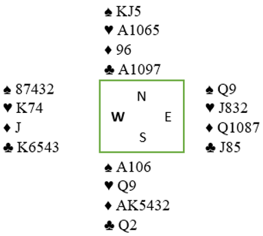 Vest hadde fått utlevert en flott vifte i dette spillet. Etter sterk, kunstig 2 kløveråpning melder vest hjerteren, antagelig to ganger, og havner i 4 hjerter til slutt. Nord spiller ut kløver dame.