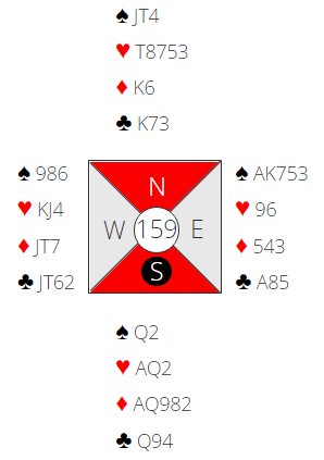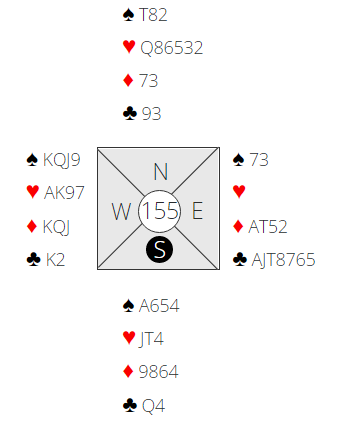 Berset-Ekren var ikke heldige her, de satt N/S mot 6NT. Nord fant spar ut som var det beste de kunne gjøre, men å holde kontrakten på kun tolv stikk og -990 ga likevel -10 til N/S.
