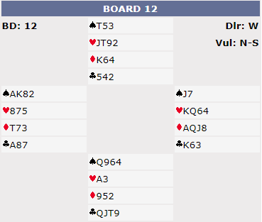 Jan J. Johannesen viste et meldingsforløp han hadde sammen med Bjørg Lystad i avsluttende runde av FBK sin tre- kveldsturnering. Spill 12 med Vest giver i gunstig sone.