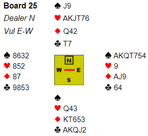 Ved det andre bordet misset N/S slemmen og spilte 5 hjerter med tretten stikk etter spar ut, N/S +510. I 4 spar doblet ble det kun en bet, N/S +200 og 7 IMP ut. Å melde slem ville gitt 11 IMP inn, en sving på 18 IMP.
