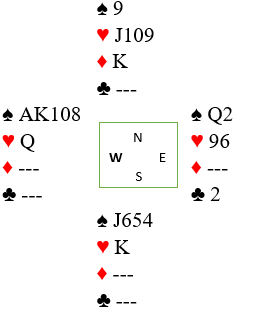 Spillefører behøver ikke mer enn fire sparstikk (kaster to hjerter). Hvis det sitter 3-2 eller knekten singel er alt greit.