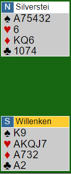 Brogeland-Bakke sine lagkamerater Silverstein-Willenken startet med 2 kløver - 2 ruter. Fordelen med frekvent å svare 2 ruter er at den sterke hånden lettere får meldt sin hånd. Syd sa 2 hjerter over nords svar 2 ruter, og nord meldte 2 spar. Da kom 3 ruter fra syd før nord sa 3 spar. Syd løftet til 4 spar. Hva nå?