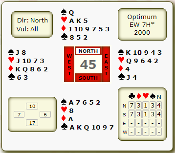I teorien er stamp i 7 hjerter av Ø/V "Optimum", står det, altså N/S + 2000. Computeren hevder altså at det med åpne kort står i 7 kløver (+2190) uansett utspill og motspill.