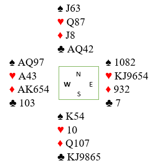 Vel, det står jo 6 hjerter om sparfargen gir fire stikk så en minortaper kan kastes. Det nytter ikke å satse på ruter, for så snart N/S kommer inn tar det selvsagt ett stikk i kløver. Så spar må sitte veldig snilt, syd må ha både knekten og kongen.