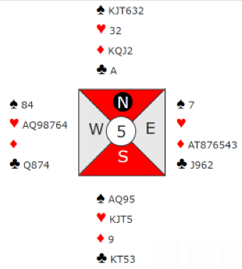 Syd går opp med ruteress og innkasserer resten av kløverstikka og fire sparstikk, og har dermed elleve stikk.