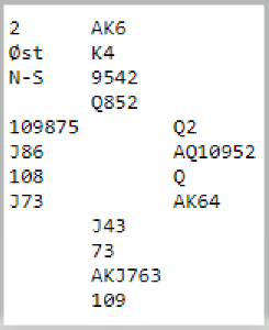 Øst åpnet med 1 hjerter og Lasse Aaseng (Oslo 1) meldte inn 2 ruter. Det er nok en innmelding ikke alle er enige i faresonen, men han hadde i alle fall en hånd som ganske sannsynlig vil produsere mange stikk om makkeren melder mye i tro på at innmelderen har noe mer. Det er dessuten mindre fare for å bli doblet når man har en så lang og god farge enn man melder inn med for eksempel 11-12 poeng og kun femkorts farge og slikt, hender som mange melder inn nokså automatisk med.