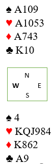Spillefører vinner altså med spar ess. Trumfen blir tatt ut i to runder, og underveis elimineres sparen ved å trumfe to spar samt at de to kløverstikkene blir tatt. Da blir dette igjen: