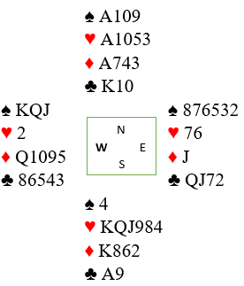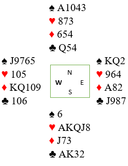 Men med den sistnevnte kombinasjonen betes 6 hjerter med ruter 5 i utspill! Lykke til med å finne det utspillet fra Q-J-10-5! Fjerde høyeste, liksom...ha ha ha!