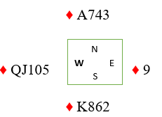 Nå spilles ruter fra syd, og om vest legger femmeren tas finessen med syveren! Merk at om ruter sitter fordelt 3-2 må det avgis ett stikk i fargen uansett, så hvorfor ikke gi bort det stikket i fargens første runde i stedet for etter at A-K er spilt?