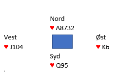 Er det slik blir det veldig galt å legge liten fra nord i andre stikk! Da har N/S fem hjerterstikk direkte hvis nord stikker med esset nå, siden spillefører bommet valget i stikk 1. Syd har i så fall spilt nieren tilbake for å avblokkere, for om han spiller etter opplegget med fordeling fra gjenværende, hjerter 5 i andre stikk vil fargen blokkeres og nord får ikke for den femte hjerteren.