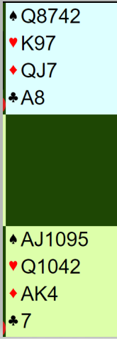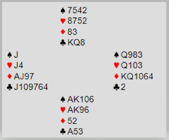 Hvis hjerterfinessen går og ttrumfen sitter 3-2 er det nesten over, og om det er en hjertertaper samt en taper i hver minorfarge er det fortsatt sjanse for å unngå spartaper. Og akkurat sparen ordnet seg med det samme da nord spilte ut spar 7 til åtteren, damen og esset. På et tidspunkt tok spillefører to hjerterfinesser, men da det viste seg at syd hadde kongen fjerde i trumf var kontrakten i fare. Slik så hele spillet ut: