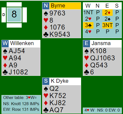 Det er ikke så mange HP til sammen, men utgangen 4 hjerter er ikke dårlig. Og det presset Willenken-Jansma seg opp i med vest som spillefører etter grandåpning og overføring til hjerter fra øst.