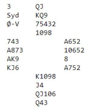 Men denne varianten hadde de ikke avtalt. Så syds 2 ruter var utgangskrav (XY), og 3 ruter var naturlig melding og viste 2-2-4-5, eller noen ganger 1-3-4-5 hvis hånden innebar et gjenmeldingsproblem som det absolutt var denne gangen. Da nord sa 3NT over syds 3 spar som viste minst sekskorts farge var det ikke lett å vite hva som er riktig med syds kort. Det kan stå slem, men det kan også være to hjertertapere fra start.