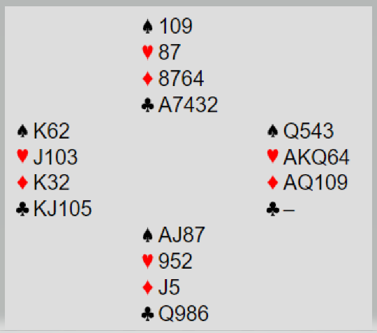 Vel, det var vel Vasset (øst) som meldte hardt da han gikk videre etter at vest hadde vist omtrent en limithøying (ca. 11 poeng +/-) med trekorts hjerterstøtte. Det er dog riktig at om vest hadde hatt de riktige kortene mot østs kort kunne lilleslem være bra. Det hadde ikke vest, bl.a. er kløver konge ikke optimalt mot renons. Men det kortet skulle likevel vise seg å være bra da syd var uheldig med utspillet da han valgte kløver.