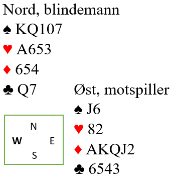 Syds grandåpning viste 15-17. Etter Stayman 2 kløver fra nord havnet de i 4 hjerter, og du er godt fornøyd med at makker fant ruter i utspill. I slik tilfeller er det opplagt å stikke over tieren, ikke legge styrke. Det kan bli temmelig dumt å legge ruter 2 som styrke om den utspilte tieren er en singelton! Da blir du antagelig sittende å se på de der ruterstikkene resten av spillet, men du får ikke stikk for dem. Så du stikker over og fortsetter med stor ruter, makker følger med nieren. Du prøver en tredje runde ruter og er fornøyd med at den også gir stikk, makkers utspill var fra 10-9 dobbelton. Tre stikk til forsvaret, men hva nå?