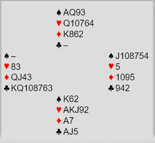 Makker (Trond Are Nitter) på vests plass har altså en lang kløverfarge. Han har sperret kraftig med sitt hopp til 5 kløver. Så dobler han motpartens storeslem! Har han kløver ess og tror det skal gi stikk? Nei, om han har det esset vil han ha liten tro på det i denne sammenhengen. Så hva er han ute etter?