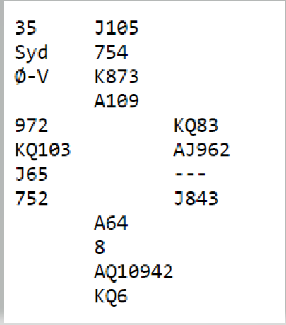 Erichsen var i 5 ruter etter at øst hadde være med og doblet opplysende (etter 1 ruter-3ruter). Vest spilte ut hjerter konge og spilte mer hjerter i andre stikk. Syd stjal og tok ut trumfen. Han trumfet så den siste hjerteren og spilte tre runder kløver. Dette var igjen: