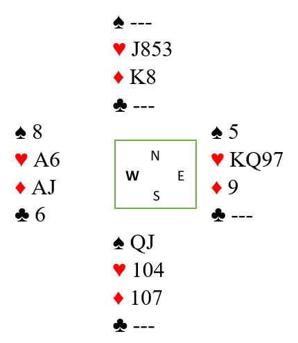 Idet trumfsekseren spilles (kaster spar 5 fra øst) må nord holde fire hjertere, så det blir kun singel ruter på han. Spillefører vet ikke hvem som har ruter konge, og derfor heller vet han heller ikke at den nå sitter singel og kan toppes ut. Men han vet at nord har kun en ruter nå. Og han bryr ikke om hvem som har ruter konge (!), for han fortsetter nå med tre runder hjerter. Da er det syd sin tur til å føle presset. Det blir igjen kun to kort, og syd må holde en spar hvis ikke spar 8 skal gi stikk. Så syd kaster ruter, og fra vest forsvinner spar 8 som har gjort nytten sin som trussel. Spillefører vet med 100% sikkerhet at ruteren sitter 1-1 idet det er to kort igjen, for nord har igjen en hjerter og syd har igjen en spar! Dermed tas de to siste med ruter til esset!