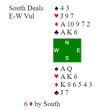 Du har altså havnet i 6 ruter som syd. La oss si vest spiller ut trumfdamen og øst følger med ruter knekt. Ved første øyekast ser det ut som om slemmen avhenger av sparfinessen. Om den ryker har du en liten sjanse til, at hjerter dame faller. Hvordan spiller du?