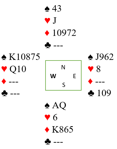 Opp med spar ess. Det tas en trumfrunde, så elimineres kløver med A-K og kløver til stjeling. Du tar for en hjerterhonnør for å ta med den bitte lille sjansen at øst har singel hjerter dame før posisjonen har blitt slik: