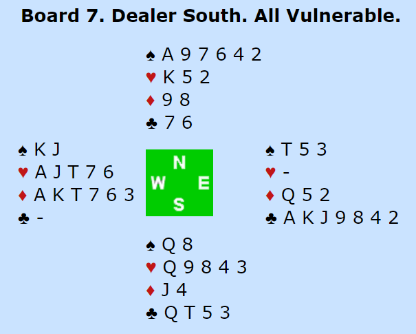 Nord tok for spar ess i utspill, og da var det ikke så veldig vanskelig. To hjertere kan trumfes hos øst, og to kan kastes på toppstikkene i kløver. Det ble en fin +1370 til notering og gevistspill for DE BOTTON da EMERALD sitt Ø/V par ved det andre bordet spilte utgang (12 IMP inn). Kampen ble til slutt vunnet med 15 IMP.