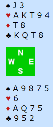Noen sier "spill major ut mot NT". Det baserer seg i at når de ikke har funnet noen majortilpasning og lander i grandkontakt så er det mest sannsynlig at et svakt punkt kan være i hjerter eller spar. Det er imidlertid ikke så enkelt bestandig. Her har det gått 1NT-3NT, så syd kan godt ha massevis i majorfargene han, for eksempel to fete firekorts farger, eller for den sakens skyld femkorts spar.