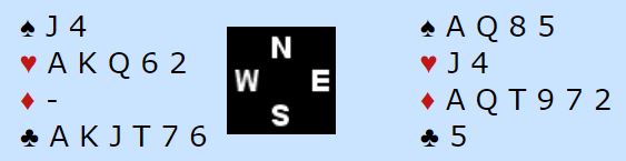 Neste spiller meldte innpå 1 spar og Jon Erik Furunes var aktiv med ved å støtte til 2 hjert5er, Vest bidro med 2 spar og nå kunne Johnsen hoppe til 5 kløver! Det viste renons i kløver og spør etter kontroller utenom kløver og med hjerter som trumf. Syd hadde dette: