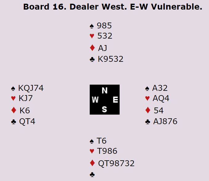 Det ser ut som en slem som avhenger av kløverfinessen hvis en ser kun på Ø/V sine kort. Ved de fleste bordene ble det spilt sparkontrakt på vests hånd.