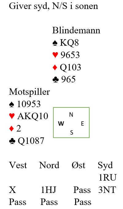 Hva slags hånd syd kan ha løser problemet idet han må kaste på hjerterstikkene. Syd kaster først spar 4, så forsvinner to små kløvere fra hans hånd. Makker kan ha ett ess i spar eller kløver, og i så fall kan det haste med å få tatt det.