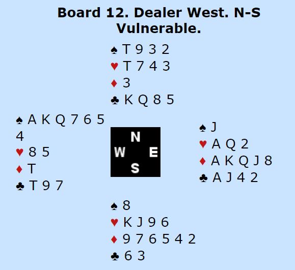 Det merkelige er at verken 7NT eller 7 spar står om det kommer ruter ut. Spillefører kommer seg ikke over til hånden for å ta ut trumfen etter å ha spilt trumfknekten i andre stikk, øst får trumfhøyning! Og i NT-kontrakt er det heller ikke inntak til vest hvis forsvaret tar bort ruter 10 i første stikk.