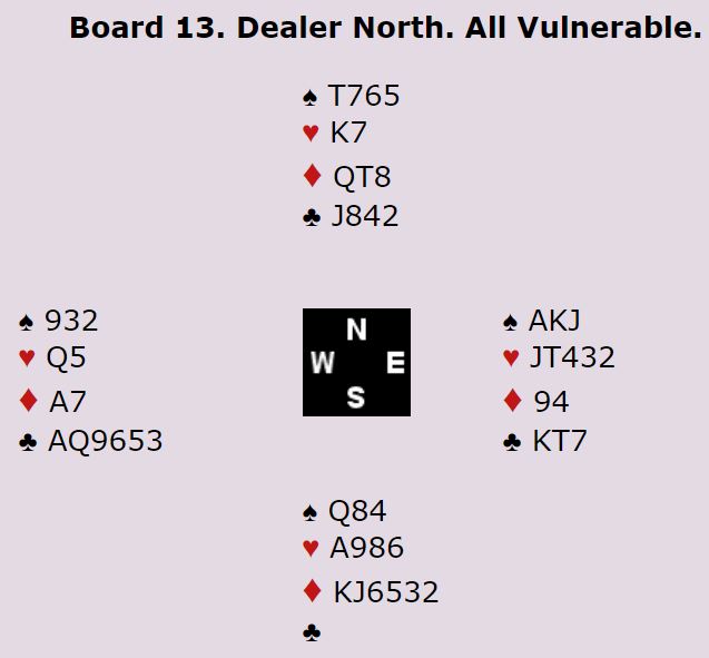 Men der nord fant spar ut var det ikke så lett. Spillefører rår bare over åtte toppstikk, og sparbeholdningen er ikke god. Men merkelig nok er spar knekt viktig her. Spillefører må lasjere den første sparen, og syd vinner stikket for spar konge. Hvis han spiller spar tilbake går det knekten fra spillefører og damen fra nord. Nå kan spillefører lasjere igjen, og det blir behagelig siden det er nord som er inne. Hvis han spiller mer spar blir det enkelt minst ni stikk da han med hjerter ess ikke har flere spar.