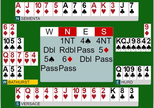 Vest burde kanskje ha meldt 5 spar med det samme i stedet for dobler? Men da vest doblet 4NT sa nord redobler, og syd viste ruterfargen pluss at han og derfor må ha hjerterfarge. Vest var så med og sa 5 spar, og nord tok sjansen på 6 ruter som øst doblet, såkalt Lighnerdobling. Det ber om unaturlig utspill, dvs. et annet utspill enn spar som øst hadde meldt. Og vest fant hjerterutspillet til stjeling før de også fikk for kløver ess, dvs. en doblet bet, USA 1 + 200. Ved det andre bordet stampet Italia i 6 spar over 6 ruter og gikk to doblede bet så USA 1 noterte +300 som N/S ved det bordet. Amerikanerne vant spillet med 11 IMP. Kampen endte med en liten seier til USA 1.