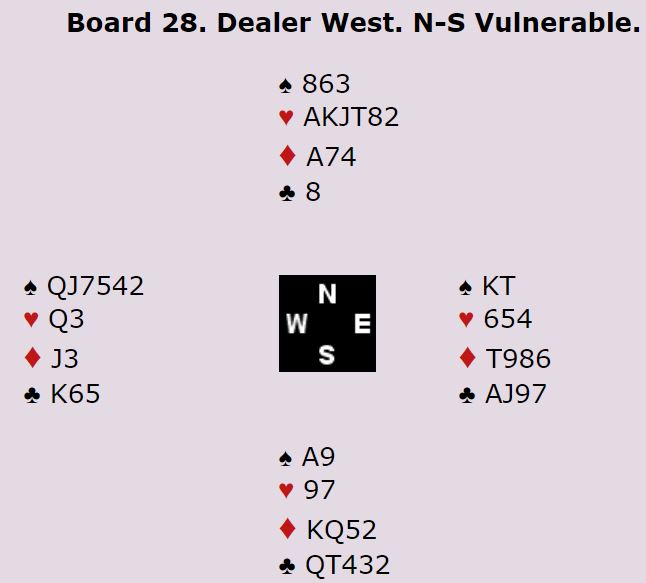 Det norske seniorparet som satt Ø/V slapp med -100 i 5 spar mens Norge ved det andre bordet +300 som N/S mot 6 spar doblet, 5 IMP inn.