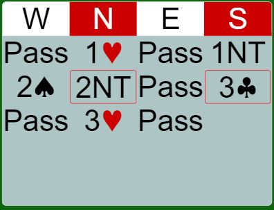 Det så et øyeblikk ut som om Brogeland skulle passe ut 3 hjerter etter disse meldingene, eller tenkte han på 3NT? Uten å være sikker så tror jeg de bruker 2NT som såkalt Good-Bad, dvs. slik Bakke meldte har han bare en vanlig åpning med lang hjerterfarge, han ville ha meldt 3 hjerter direkte med sterkere kort. Etter lang betenkning løftet Boye til 4 hjerter og de hadde funnet beste beste kontrakt.