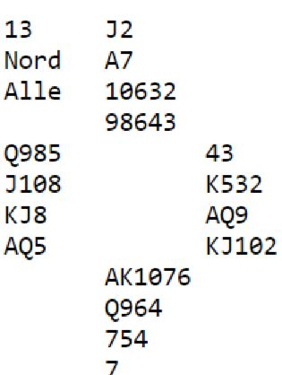 Om vest vinner med spar dame i første stikk behøver han ett stikk i hjerter for å komme til ni stikk. Da blir det bet om nord fyker opp med hjerter ess med det samme og spiller sin andre spar, N/S vinner i alt fire sparstikk og for hjerter ess. Men vest kan forpurre den planen for forsvaret ved å ligge unna med spar dame i første stikk. Nord spiller nok mer spar i andre stikk, men nå kan også kontrakten vinnes hvis syd på det tidspunktet tar for begge sparhonnørene og fortsetter fargen. Da har spillefører 1+0+3+4 = 8 sikre stikk og vinner det niende om han får tak ett stikk i hjerter. Men spillefører må ikke ta hjerterfinessen. Og å spille hjerter til kongen i stedet for å ta finessen er logisk siden syd ikke kan få komme inn til sparstikkene. Om syd har hjerter ess er det ikke mulig å vinne 3NT etter den utviklingen.
