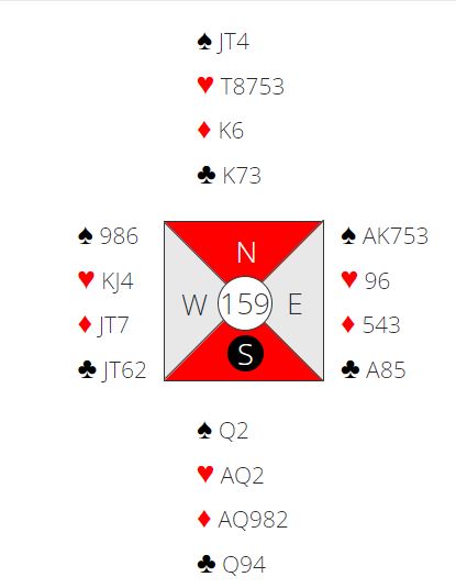Det var imdlertid hele fem N/S-par som vant 3 hjerter! Da må motspillet ha klikket, og spillefører må ha blitt kvitt tapere (sannsynligvis alle nord sine tre kløvere) på ruterfargen. Men spillefører må innom Ø/V, og at det ble ni stikk ved de fem bordene skjedde stort sett der syd var spillefører så motspillerne ikke så den truende ruterfargen. Å notere +140 ga +22 til N/S. Så det svingte altså hele 32 poeng om motspillet klaffet eller ikke mot 3 hjerter.