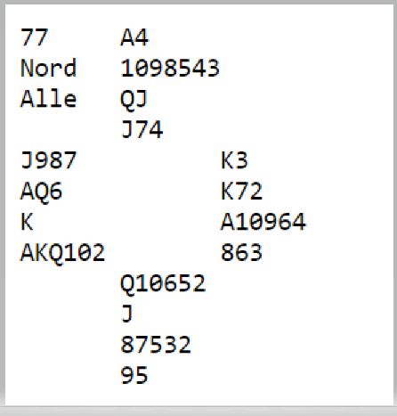 Noen få fikk kun elleve stikk. De må nesten ha oversett at ruteren ordnet seg så fint? Pluss 660 for 3NT med elleve ga -20. Det verste du kan få på et spill i parfinalen er -26.