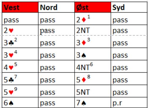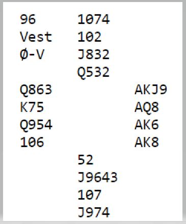Vinnerparet var det eneste paret i salen som noterte +2210. To par til var i storeslem, men de prøvde seg på 7NT hvor det var kun tolv stikk. Det trettende stikket i sparkontrakten er ett ekstra trumfstikk ved å ta en kløverstjeling på vests hånd.