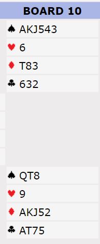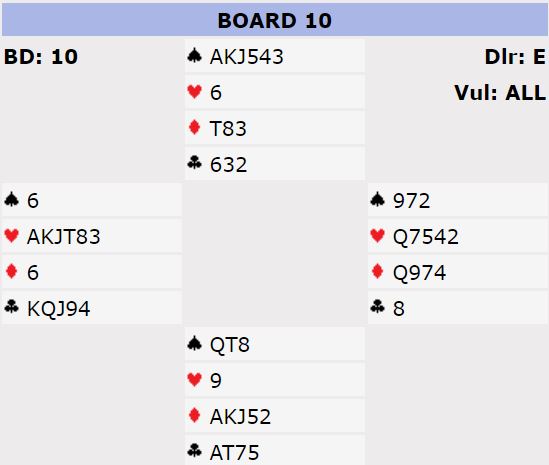 Det er double dummy spilling så det holder, og ingen spilte slik. Kun tre spilleførere vant 5 spar. Hele seks spilte den bort. Ellers var det endel som gikk bet i 5 hjerter som Ø/V, men nesten en tredjedel av Ø/V-parene fikk spille 4 hjerter og vant den med ti stikk.