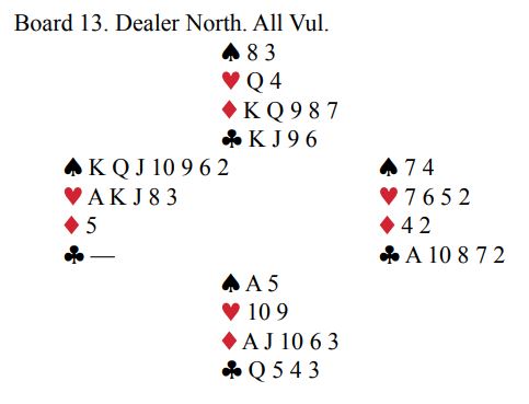 Klukowski tapte ett ruterstikk og til spar ess, men ikke mer. Så det ble den hyggelige scoren +850 i favør ZIMMERMANN. Klukowski og Kalita gjettet neppe på at +850 skulle gi 13 tapte IMP! Men jo da, det sørget sjefen sjøl for. Meldingene ved det andre bordet gikk slik:
