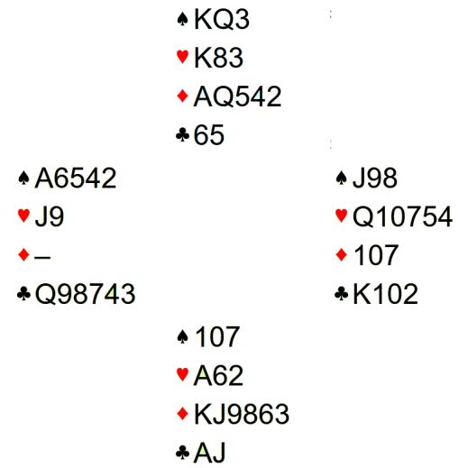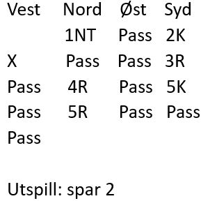 Det er en bitte lille annen mulighet som jeg nevnte, satse på et innspill. Hvis spar konge legges i første stikk forventes at esset kommer på fra øst fulgt av mer spar, eller mer sannsynlig kløverskift. La oss si at det sitter slik at øst stikker sparhonnør med esset og det kommer kløverskift til esset. Da kan trumfen tas ut og sparen elimineres med den andre honnøren fulgt av den siste sparen til stjeling. Så tas A-K i hjerter fulgt av kløver kløver knekt i håp om at vest kommer inn og at han ikke har flere hjerter. I så fall må vest fortsette med spar- eller kløver til dobbeltrenons som gir avkast av en hjerter fra den ene siden mens det stjeles på den andre. Dette avhenger av at vest har kun to hjertere fra start, ikke umulig (og det hadde han jo). Men for at det skal fungere må vest også ha K-Q i kløver, og det er veldig usannsynlig, for med K-Q i kløver ville nok vest spilt ut kløver konge.