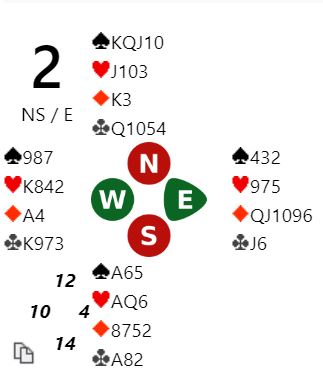 Jeg vet ikke om N/S hadde helt kontroll på dette, men syds 2NT-melding gjorde at grandkontrakt ikke var så fristende. Grandkontrakten ville blitt på feil side, for de visste jo ikke at ruter ess satt foran. Så det ser litt ut som de snublet seg ut i 4 spar, en sårbar kontrakt med kun 4-3 i trumf. Det måtte sitte litt snilt.