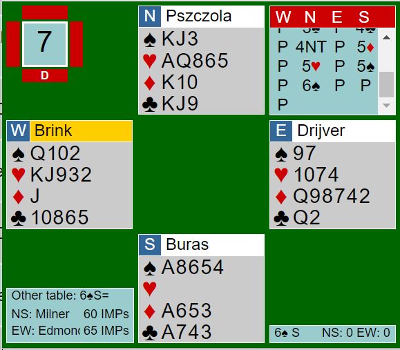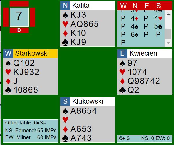 Men spillet ble bare uavgjort da en annen polakk, Buraas også vant 6 spar, dog på en helt annen måte etter hjerterutspill fra vest.