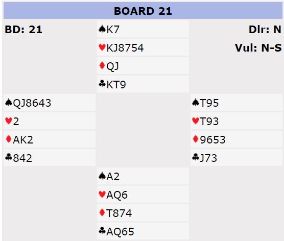 Det var en dårlig slem når nord hadde Q-J i ruter i stedet for kongen. Men uten ruter ut står 6 hjerter da en ruter forsvinner på kløveren.