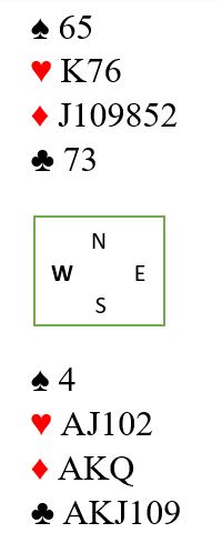 Hva tror du nord har for hoppet til 5 ruter? Merk at han ikke meldte over 3 spar, så sterk er han ikke. Lang ruter og et et viktig kort må han vel ha, og det kortet er nok i hjerter. Allan Livgård løftet til 6 ruter. Slik så hele spillet ut: