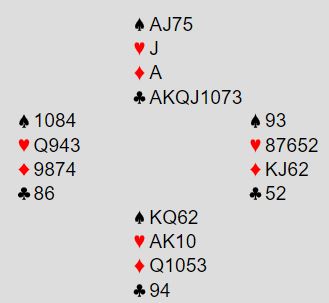 Meldingene gikk vest/øst 2 kløver, 2 grand, 3 grand. Syd spilte ut ruterdame, og øst dukket i et forsøk på å bryte forbindelsene hos motparten, eller forberede en eventuell skvis. Syd fortsatte med ruterknekt som øst stakk med esset. Sparknekt ble dekket med damen, og etter sparkonge fortsatte øst med en liten kløver til kongen, og spilte hjerter til damen, som nord stakk med hjerterkonge. Hjerterknekt i retur ble stukket med esset. Og deretter, på rutekonge kastet nord en spar og øst handa sin tredje hjerter. Øst fortsatte med spar ess og spar til tieren. Handas siste spar med hjerteravkast i bordet satte press på nord, som ble tvungen til å gi slipp på enten hjerter eller kløverholdet. Valget falt på sistnevnte, slik at kløver 6 endte opp som det ellevte stikket.
